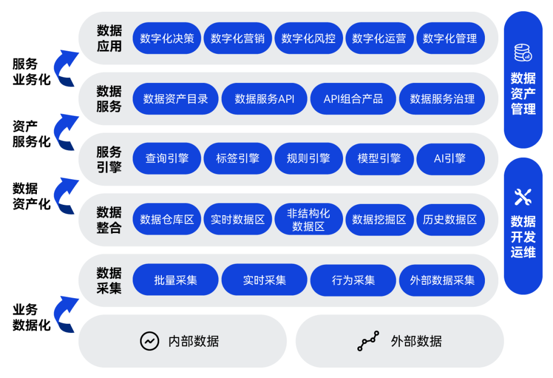 長亮科技作為國內金融IT的龍頭企業,自成立起一直深耕金融數據體系建設。歷經20年發展,長亮科技參與并見證了金融行業從信息數字化、業務數據化到數據業務化的發展變遷。目前,公司已經形成了品類豐富的數據產品,可為金融機構輸出“謀、聚、管、算、用”五位一體的整體解決方案,從業務數字化、數字資產化、資產服務化到服務業務化,激活行方的數據要素潛能,助力銀行打造一體化數據閉環,以金融科技為支撐,建設智慧銀行。