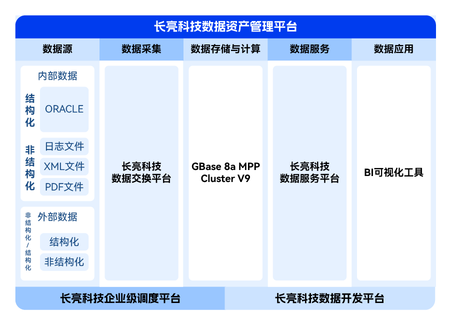 在該項(xiàng)目中,雙方基于南大通用GBase 8a MPP Cluster以及長亮科技數(shù)據(jù)開發(fā)、數(shù)據(jù)交換、企業(yè)級調(diào)度、指標(biāo)管理、數(shù)據(jù)補(bǔ)錄等平臺產(chǎn)品的組合方式,為承德銀行搭建了HADOOP+MPP 混搭架構(gòu)的基礎(chǔ)數(shù)據(jù)底座。其擁有數(shù)據(jù)采集、數(shù)據(jù)預(yù)處理、數(shù)據(jù)存儲、數(shù)據(jù)建模、數(shù)據(jù)分析、數(shù)據(jù)可視化等能力,可為全行數(shù)字化轉(zhuǎn)型提供數(shù)據(jù)支撐。