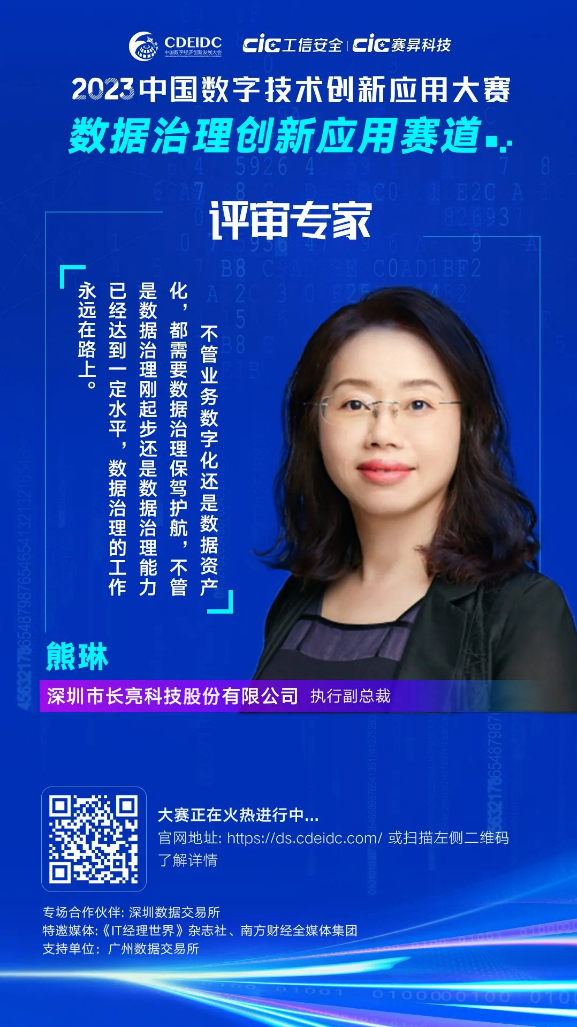 本次大賽是面向全社會公開的全國性賽事,深圳市長亮科技股份有限公司執行副總裁熊琳將作為本次大賽評審專家,圍繞數據治理能力提升方案、數據治理創新產品技術兩個賽題方向,對參賽作品進行評審選拔,敬請期待!