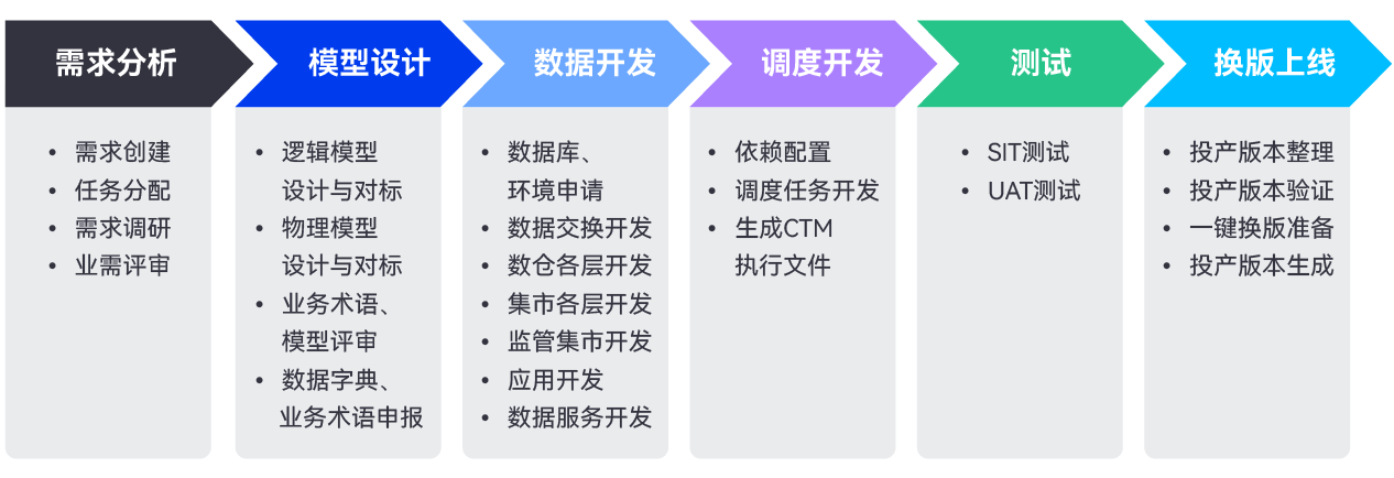 該平臺打通了數據研發運維從需求到上線的多個關鍵環節,通過敏捷需求管理、模型設計即治理、全開發場景支持、自動化單元測試、一鍵提測與發布、全面需求監控的全鏈路智能化管控,確保數據開發全過程的順暢與協同。