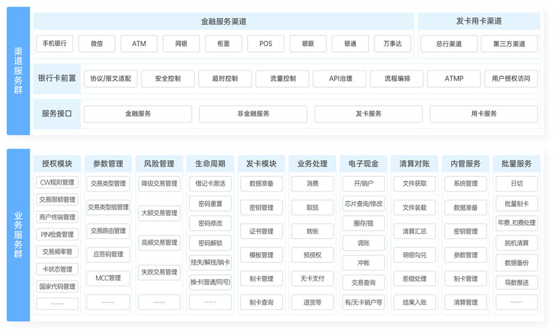 基于SunCard銀行卡平臺,廣泛吸收已有客戶的先進業務經驗,學習已有客戶的優質業務模型,以普惠客戶為出發點,具備以客戶為中心,以產品為業務框架,以卡體系為業務實體,以合約為業務紐帶,以事件為業務驅動,輔以靈活多變的賬戶體系與計價體系的松耦合、高擴展、高效穩定的,完全自主知識產權的特點。系統包含卡管、密鑰管理、數據準備、電子現金、制卡用卡五大微服務群,為銀行提供借記卡全方位的業務處理支持。