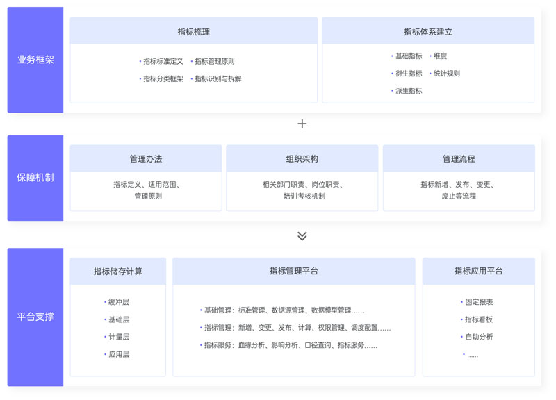 通過企業級指標統一管、算,實現指標全生命周期統一管理,包括三個方面:貼合企業現狀及遠景規劃,制定指標管理機制;以業務場景為驅動,以存量指標體系梳理為基礎,形成企業級統一的指標體系,并規劃指標庫數據模型落地實施;搭建指標管理平臺,實現指標的統一定義、統一加工、統一管理、統一服務。
