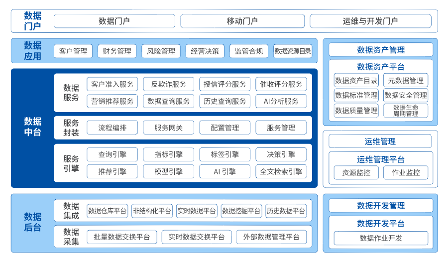 長亮科技數據中臺方案涵蓋了數據采集、數據存儲和計算、數據服務、數據應用、數據資產管理,及數據開發和運維等多種數據能力,不僅能夠積累和沉淀數據,還可以高效快速地響應需求、實現數據能力復用,充分發揮數據資產價值: