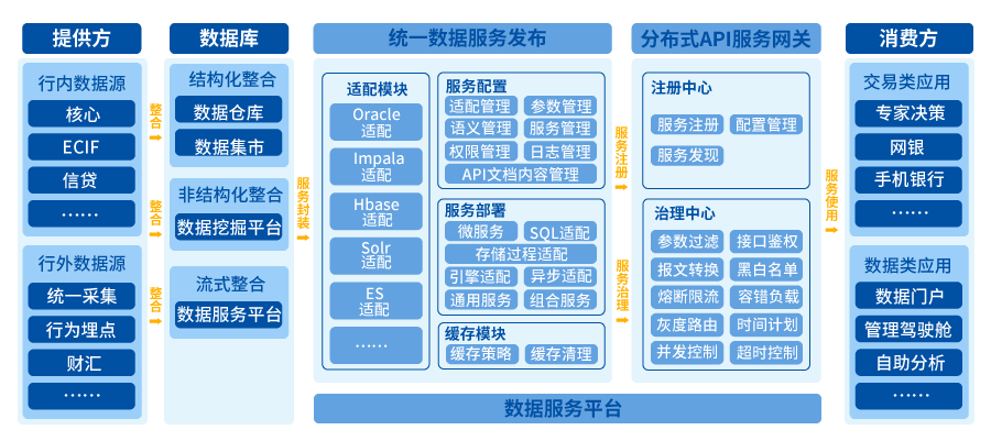 長(zhǎng)亮科技數(shù)據(jù)服務(wù)平臺(tái)定位于企業(yè)級(jí)數(shù)據(jù)服務(wù)中心,主要提供業(yè)務(wù)系統(tǒng)之間、數(shù)據(jù)平臺(tái)與上下游系統(tǒng)之間的數(shù)據(jù)服務(wù),采用微架構(gòu)實(shí)現(xiàn)高吞吐量、高可用性和高擴(kuò)展性: