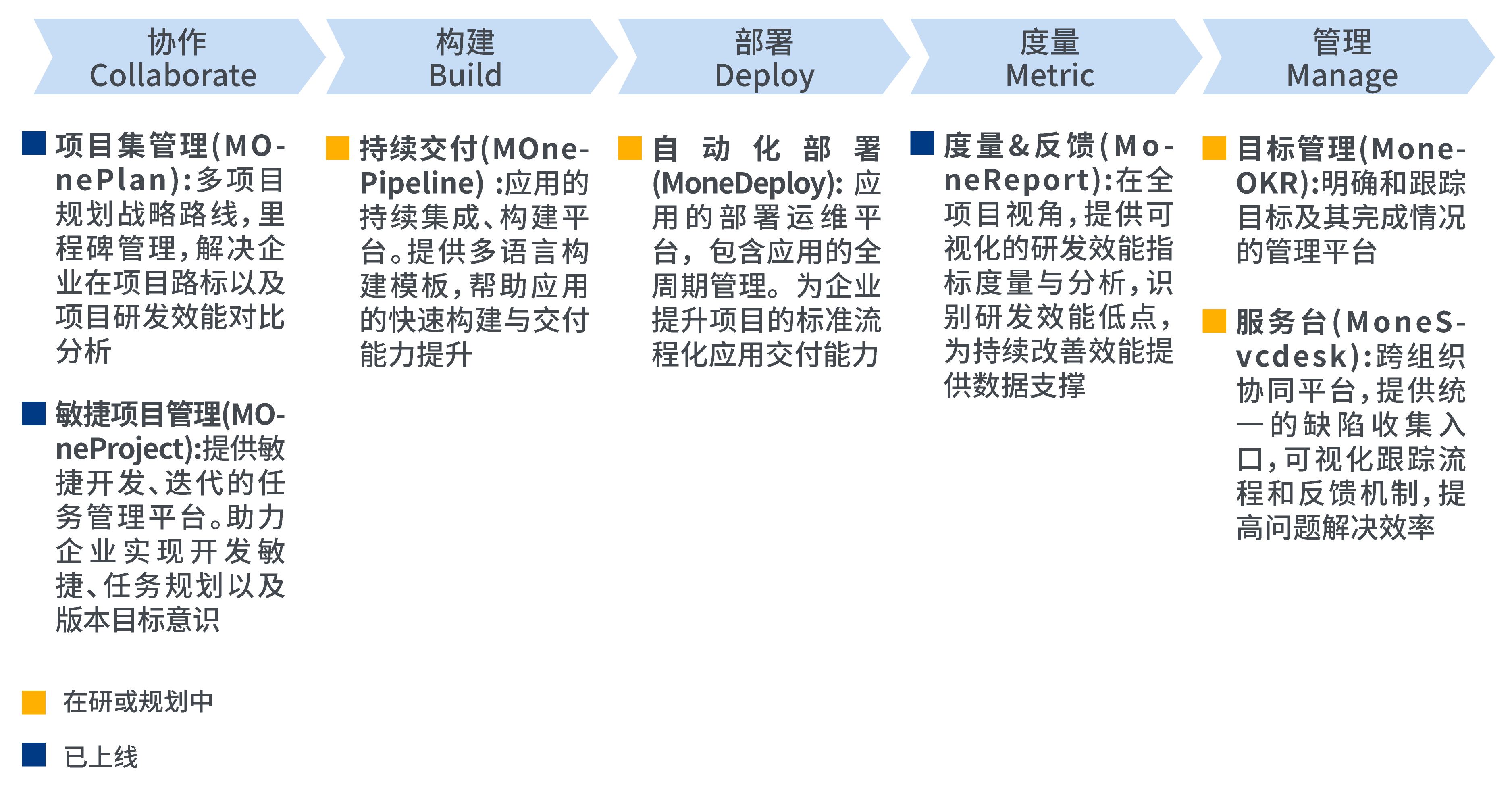 ◆ MOne覆蓋產品研發全生命周期,從目標規劃、需求管理、迭代跟蹤、代碼管理、構建管理、測試管理、部署發布全過程,實現研發管理一站式交付;