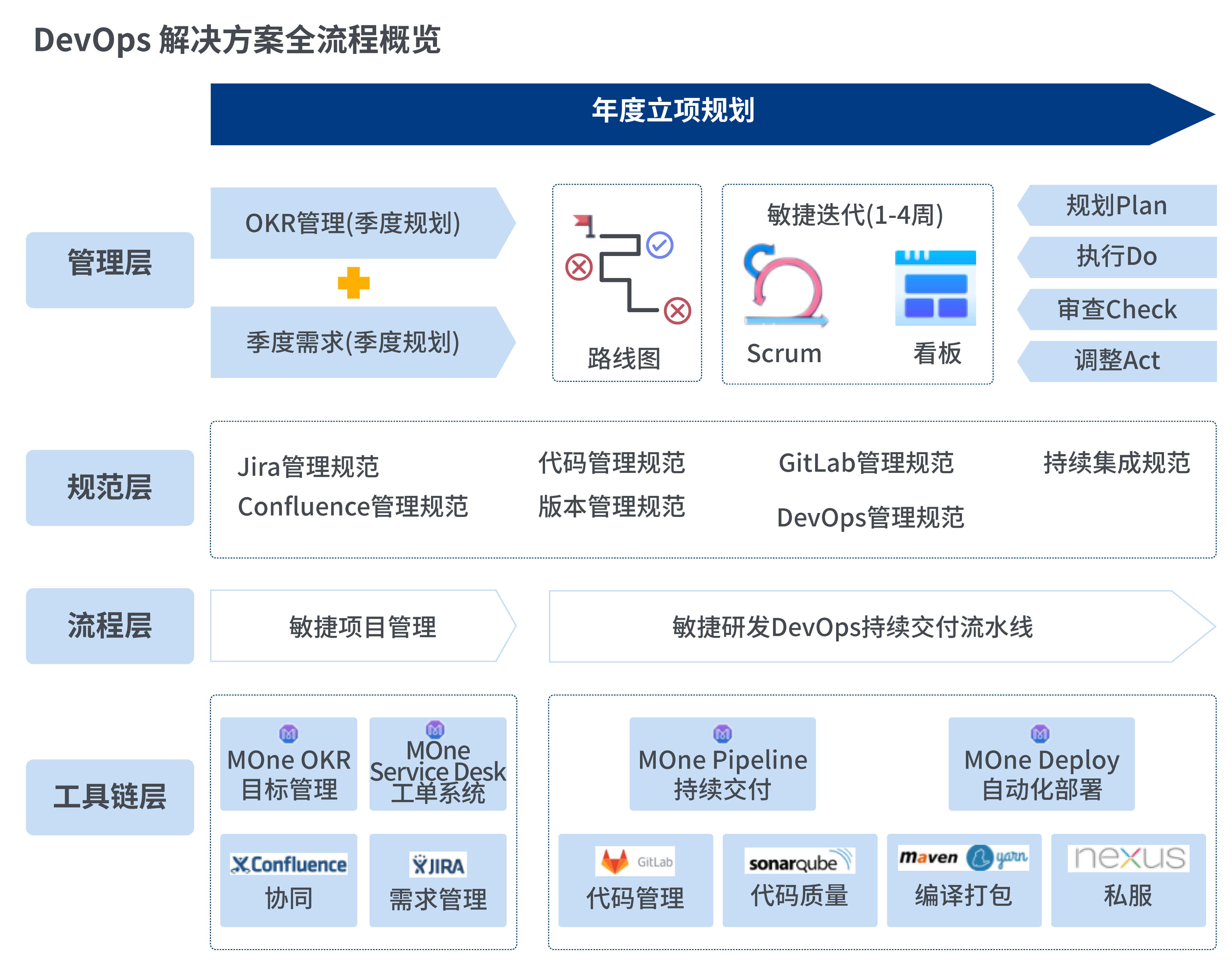 在實施 DevOps 過程中,基于 DevOps 理念,長亮科技通過自研的一站式研發協同管理平臺(Manager One,以下簡稱MOne平臺),實現了 DevOps 變革中工具的支撐,同時依托工具,制定了一套規范流程,將流程內建于工具之中,通過工具來指導實踐。通過流程規范+工具機制,提煉了一套研發效能解決方案,即結合 MOne 平臺與應用場景提供的敏捷項目管理、DevOps持續交付流水線及外部工單支持系列解決方案。