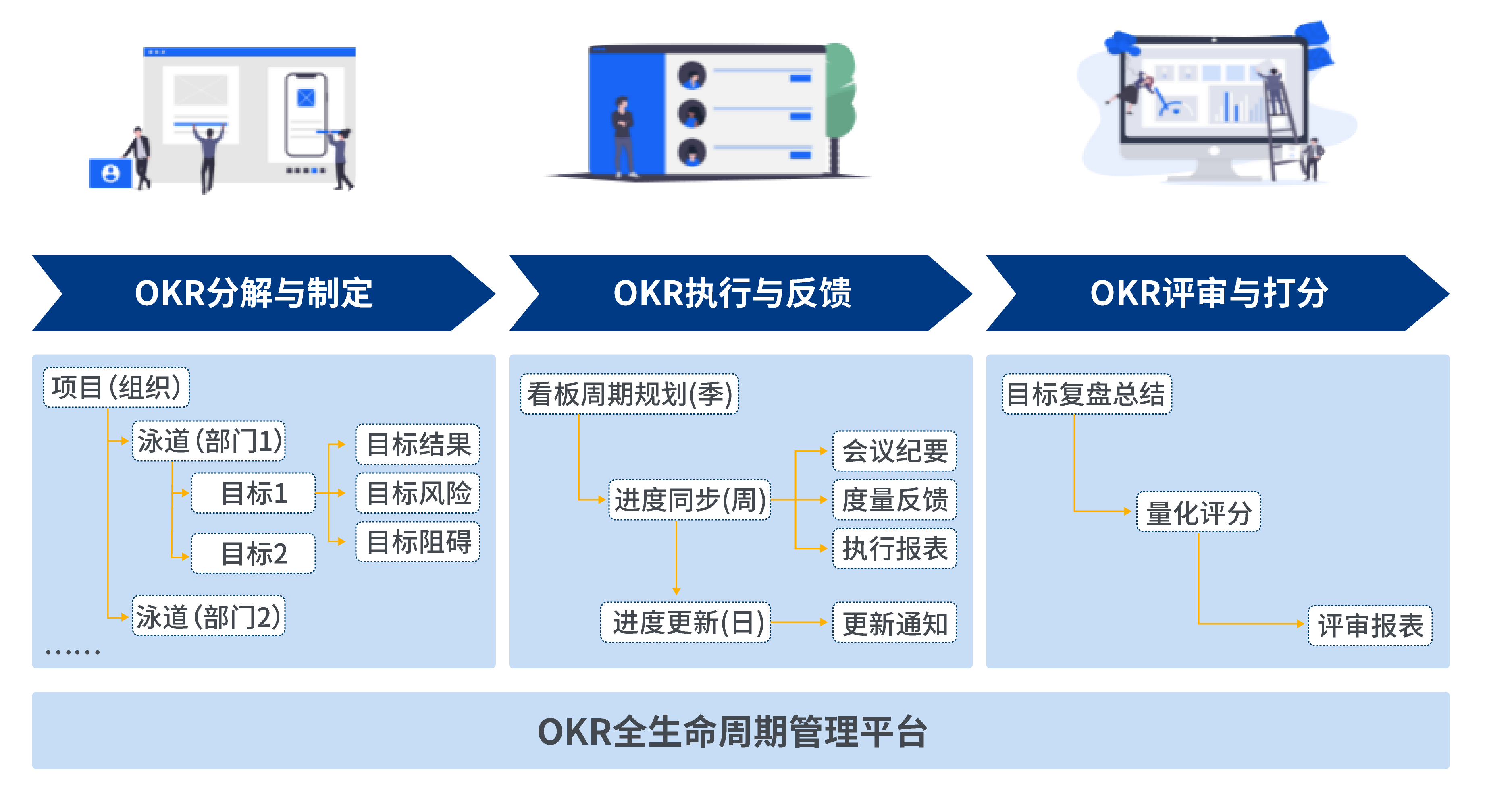 ?在功能方面,MOne OKR 規劃季度(月度)短期目標,通過集成 Jira 實現自動跟蹤和度量目標完成進度,結合 Scrum 敏捷開發方法,通過迭代沖刺的方式持續交付,從用戶需求到需求實現一個個閉環的軟件開發過程,實現季度規劃、迭代實現,最終實現目標。