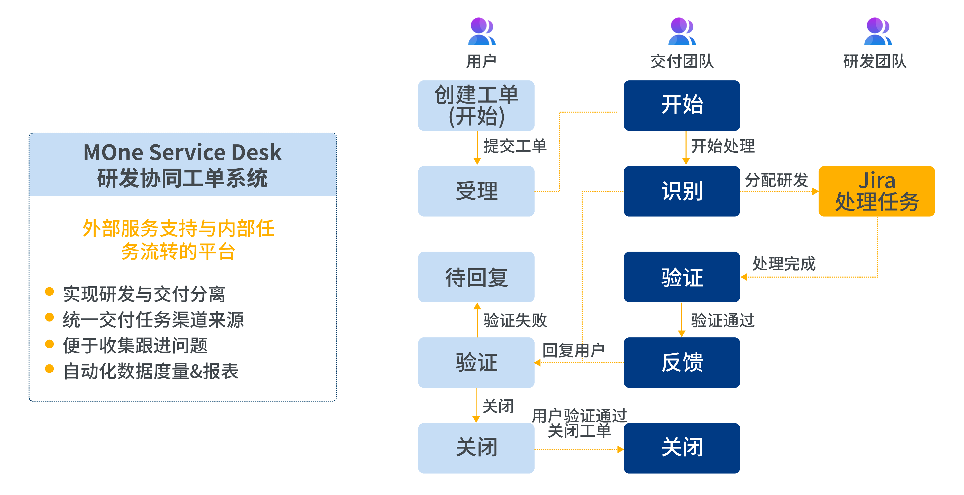 MOne Service Desk 研發協同工單系統為不同的使用者提供了對應的流程規范: