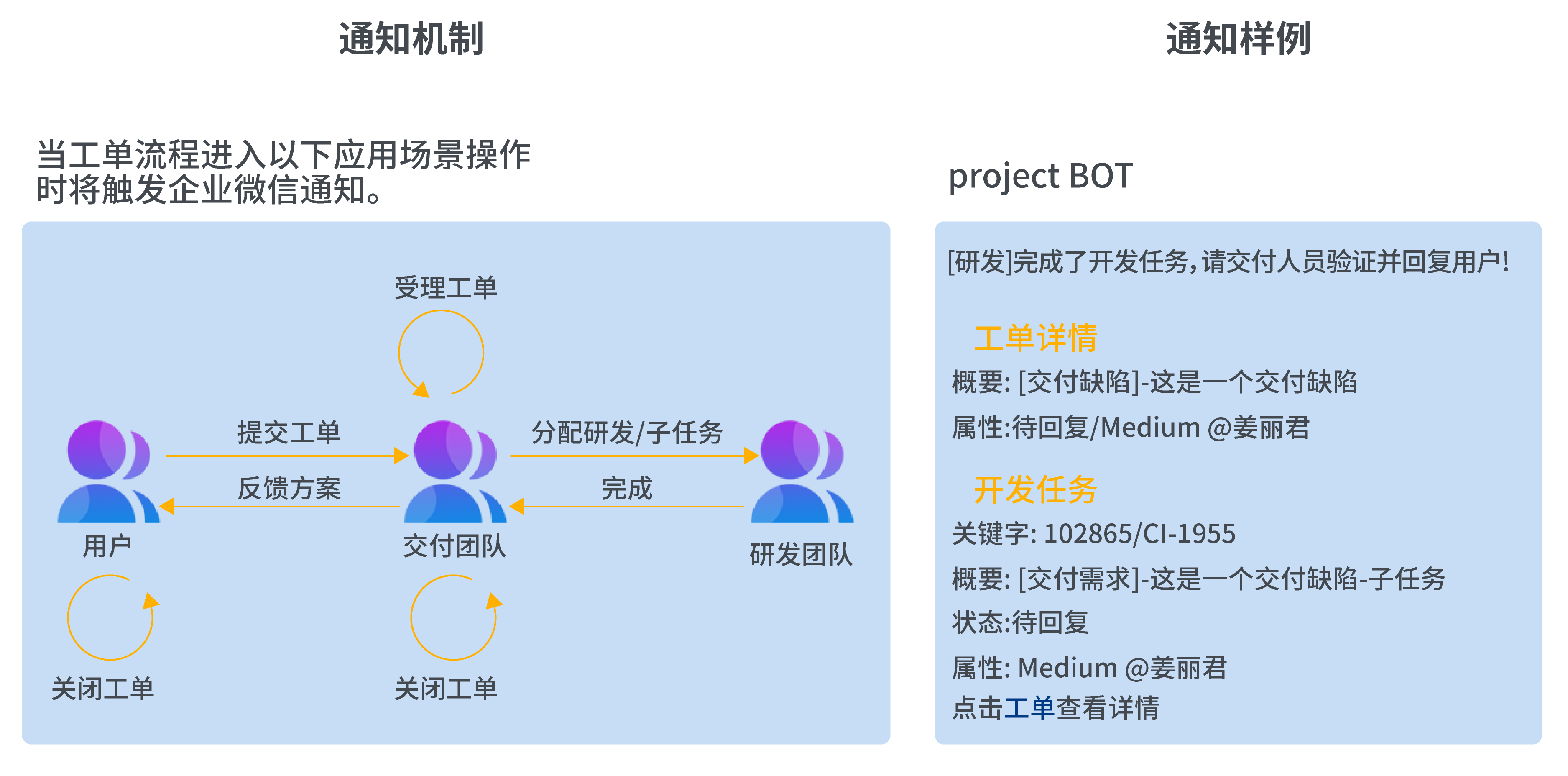 ◆企業微信通知機制:工單集成了企業微信機器人通知,當工單階段流轉時將觸發企業微信通知。