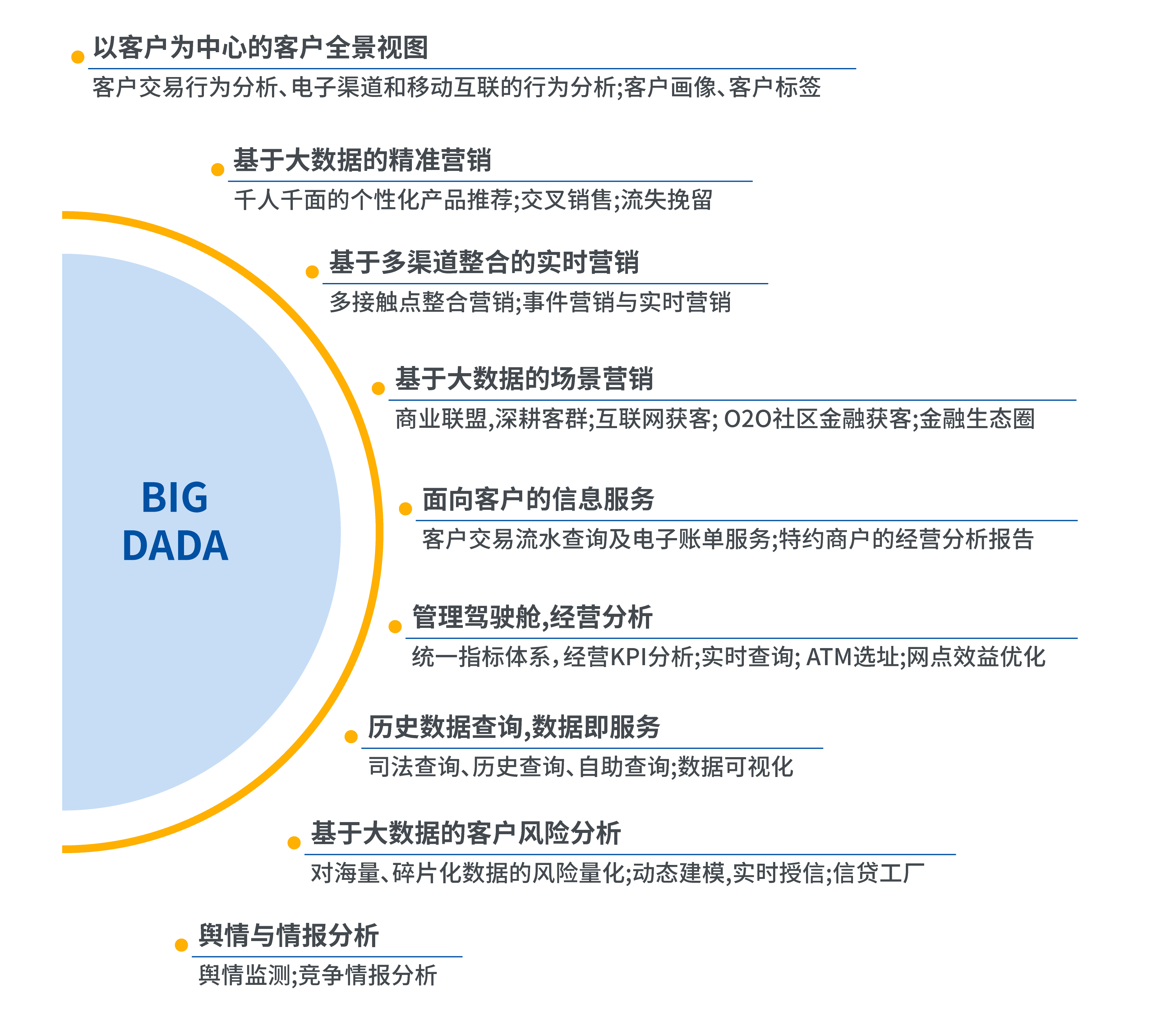客戶畫像丨深度分析挖掘,對客戶交易行為、金融產(chǎn)品偏好、渠道偏好實(shí)現(xiàn)全面了解,實(shí)現(xiàn)客戶畫像和分群、客戶實(shí)時(shí)評價(jià)。在與第三方進(jìn)行聯(lián)盟之后,還可以實(shí)現(xiàn)完整的客戶全景視圖。