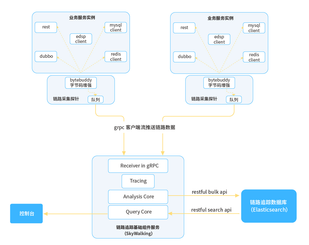 ● 鏈路追蹤:與性能監控探針技術類似,利用Java探針技術,遵循OpenTracing標準,收集全鏈路數據,并分析鏈路數據形成調用拓撲;應用實例通過平臺SDK注冊到平臺獲取到APM組件信息,通過APM組件客戶端對APM組件進行相關初始化操作,之后依托Agent字節碼增強技術在相應位置進行埋點,定時將鏈路數據推送至APM組件進行分析并持久化,同時將MDC信息填充到日志,從而實現鏈路與日志的聯動;平臺本身通過訪問APM組件暴露的端點獲取相關鏈路數據。
