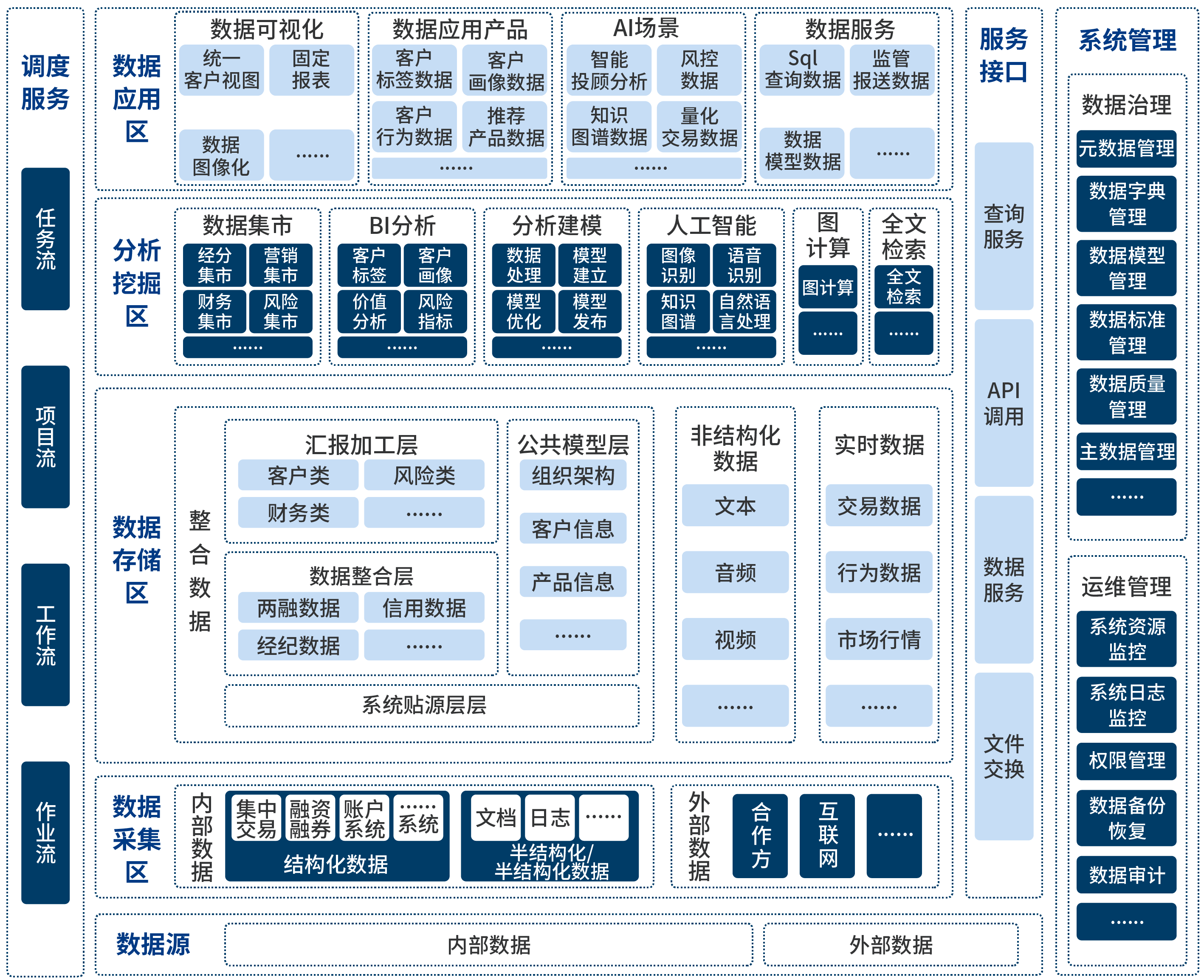 隨著證券行業大環境的變化,證券公司為實現業務戰略轉型、業務變革與創新發展,對數據的分析、應用提出了更高的要求。基于大數據平臺,可有效整合企業內外部數據信息,構建金融科技基礎能力,為證券公司業務拓展提供數據應用、數據分析、數據洞察決策等敏捷支撐。