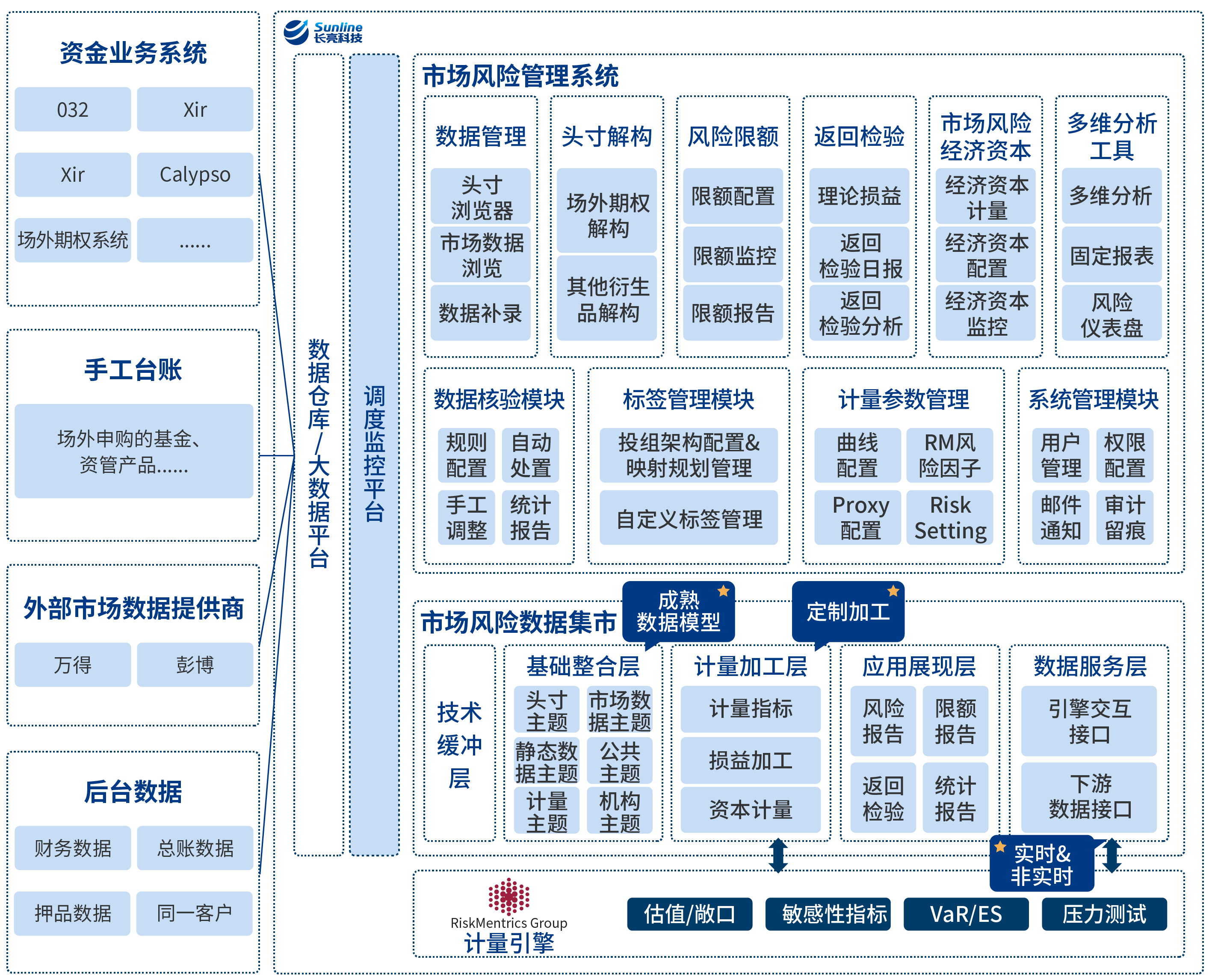 基于成熟的市場風險計量引擎和引擎廠商提供的相關產品及咨詢服務,結合最新的監管規定和領先的同業實踐,調研證券公司自身的系統和數據環境,完成數據到計量結果的全流程展示,并支持新產品及業務功能的個性化擴展,為證券公司提供專業的市場風險管理系統。