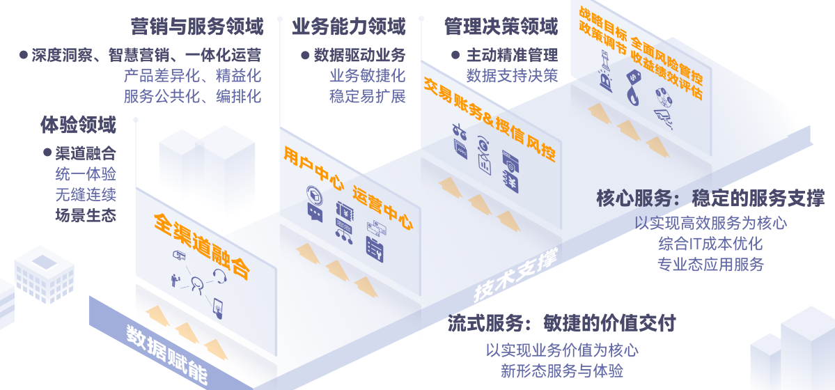 面向服務(wù),基于業(yè)務(wù)領(lǐng)域而非軟件系統(tǒng)結(jié)構(gòu)提供支持;以用戶為中心,提升客戶洞察能力,基于用戶旅程提供服務(wù);產(chǎn)品定價(jià)細(xì)化到場景級,根據(jù)不同維度差異化開展?fàn)I銷活動(dòng),細(xì)化服務(wù)與風(fēng)險(xiǎn)管控能力;打破信息壁壘,統(tǒng)一產(chǎn)品、參數(shù)與客戶視圖;業(yè)務(wù)策略組件化、配置化,產(chǎn)品工廠能夠快速發(fā)布新產(chǎn)品;大運(yùn)營平臺支持全平臺運(yùn)營,業(yè)務(wù)資源可彈性部署;基于數(shù)據(jù)進(jìn)行業(yè)務(wù)策略的迭代演進(jìn),支持零售業(yè)態(tài)聯(lián)動(dòng);所有服務(wù)7*24可用