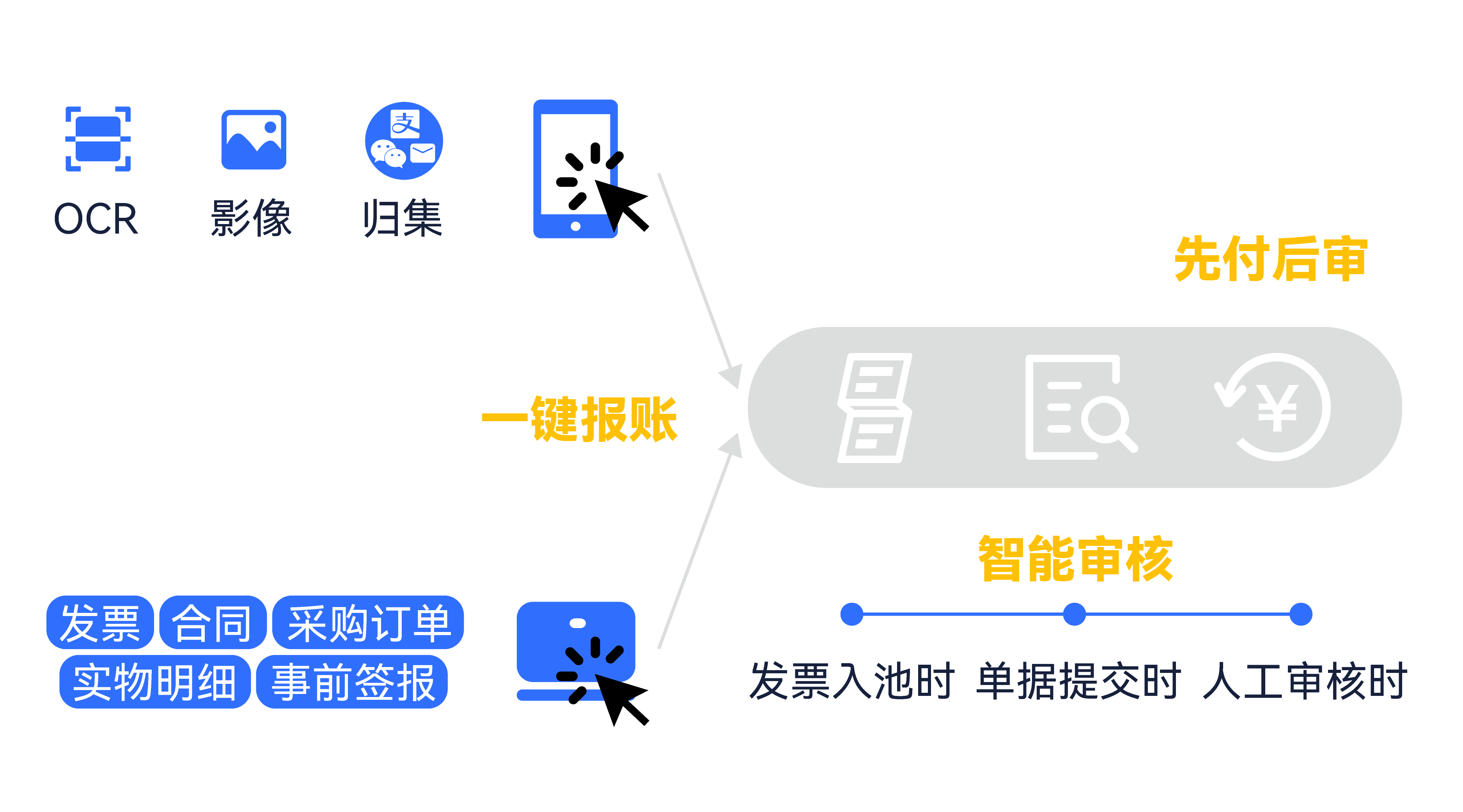 當員工需要提交報銷單據(jù)時,只需通過手機或掃描儀對原始發(fā)票進行影像獲取,系統(tǒng)將對其進行智能OCR識別,并同步完成四合一處理,實現(xiàn)“拍照即報銷”。